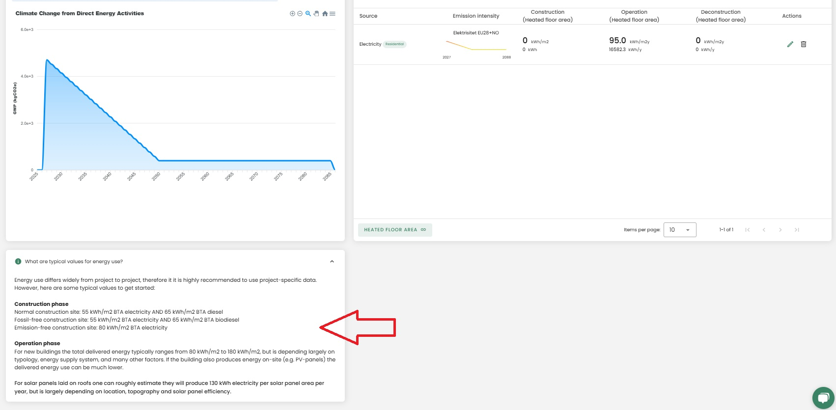To calculate greenhouse gas emissions for energy use, we need the delivered energy. Additionally, if the building uses district heating or possibly bioenergy, we also need the number of delivered energy for each individual energy source to get correct results. These numbers are needed before we can proceed. Usually, the project's consultant has access to these information.
