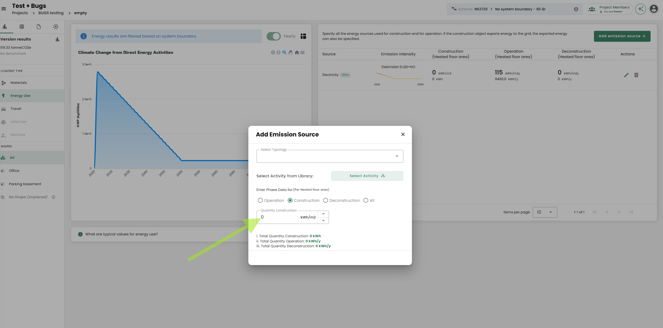 In Reduzer, emissions from energy use and machinery on the construction site can be added manually under Energy Use > Construction. There, you can choose whether to place the energy emissions under Operation, Construction, or Deconstruction. You’ll need to enter a value in kWh/m² and link it to a relevant activity from our library (see the screenshot for guidance). If you don’t have specific kWh data from your project, you can use our default estimates. However, please note that these are very rough and may not accurately reflect your project's actual energy use.