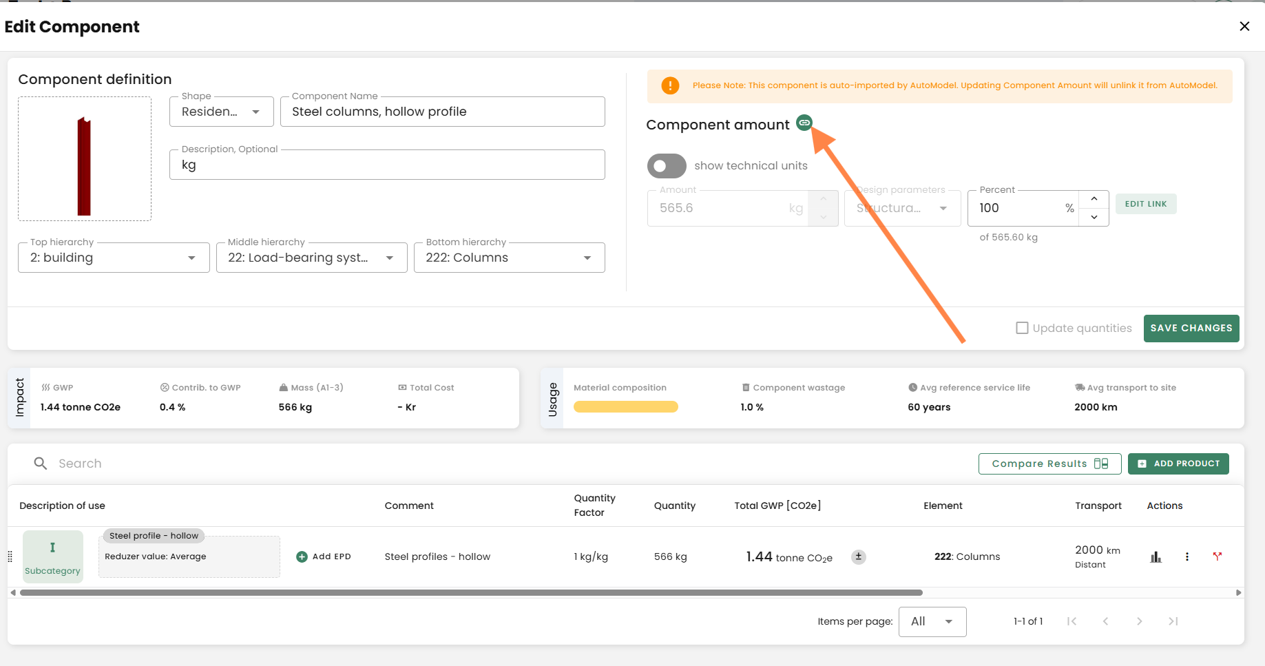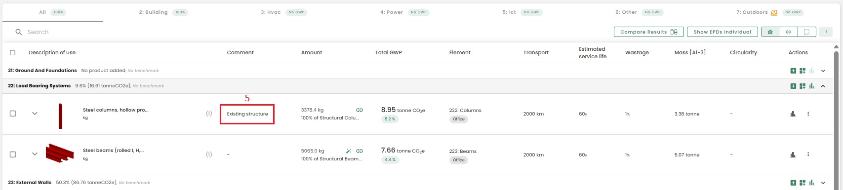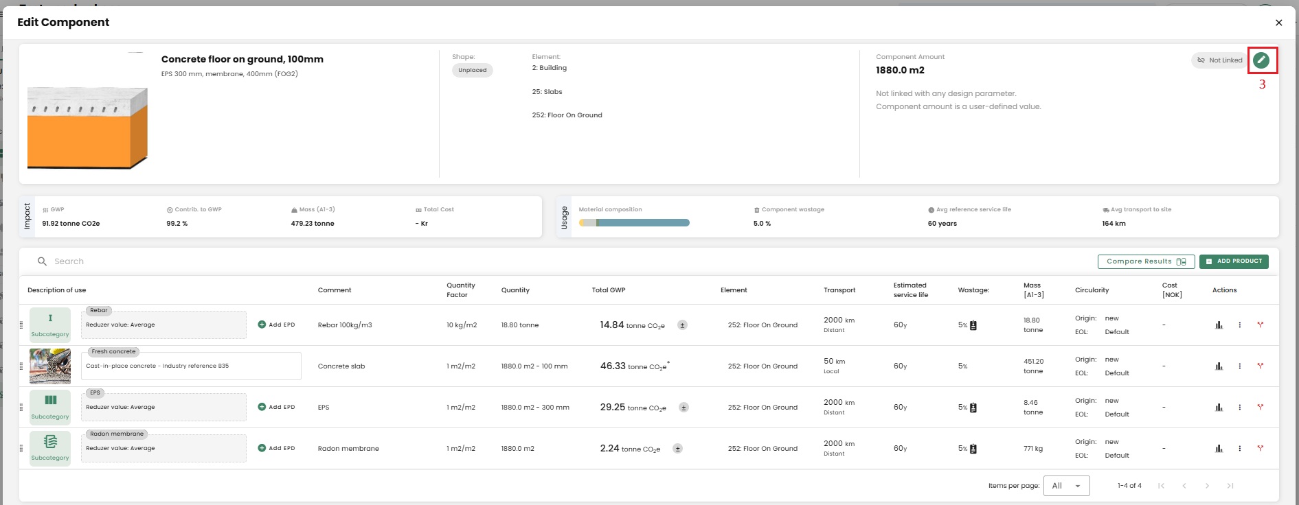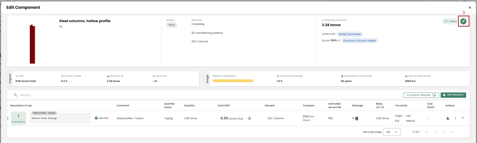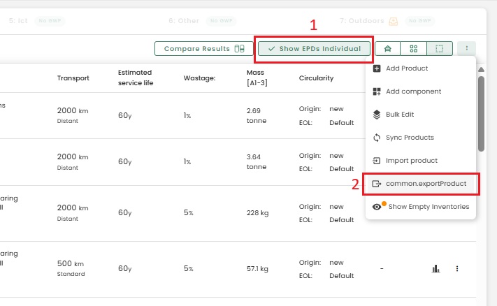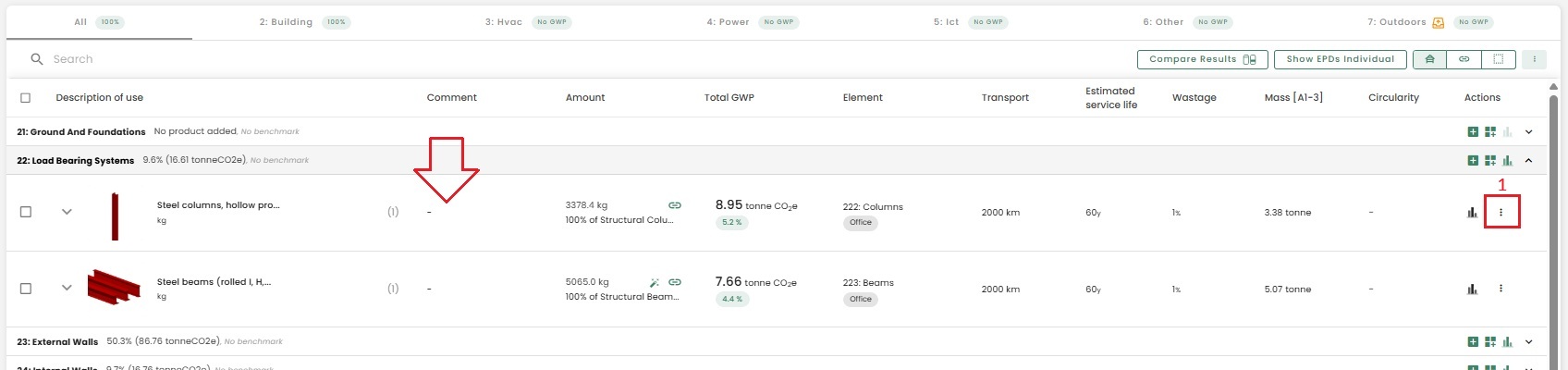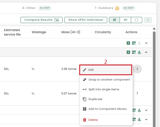 The emissions of reused materials will be reduced by 80% in A1-A3. This is the standard estimate that we have applied for all the schemes, and it is a conservative assumption. You can find the option to change the origin of your product by selecting the "3 dots" that allows you to edit a product.