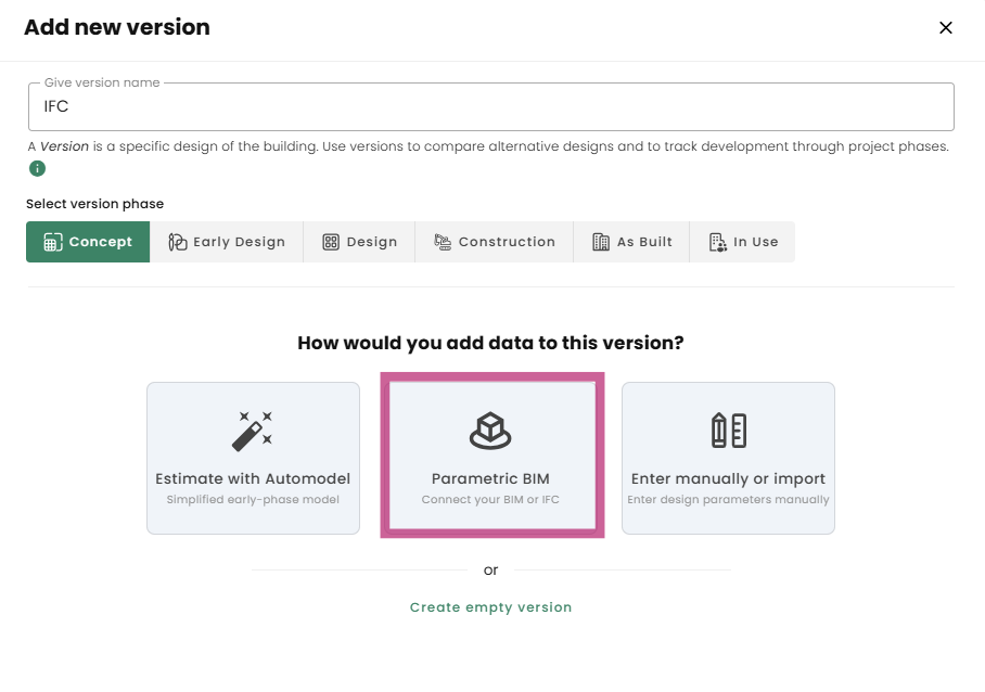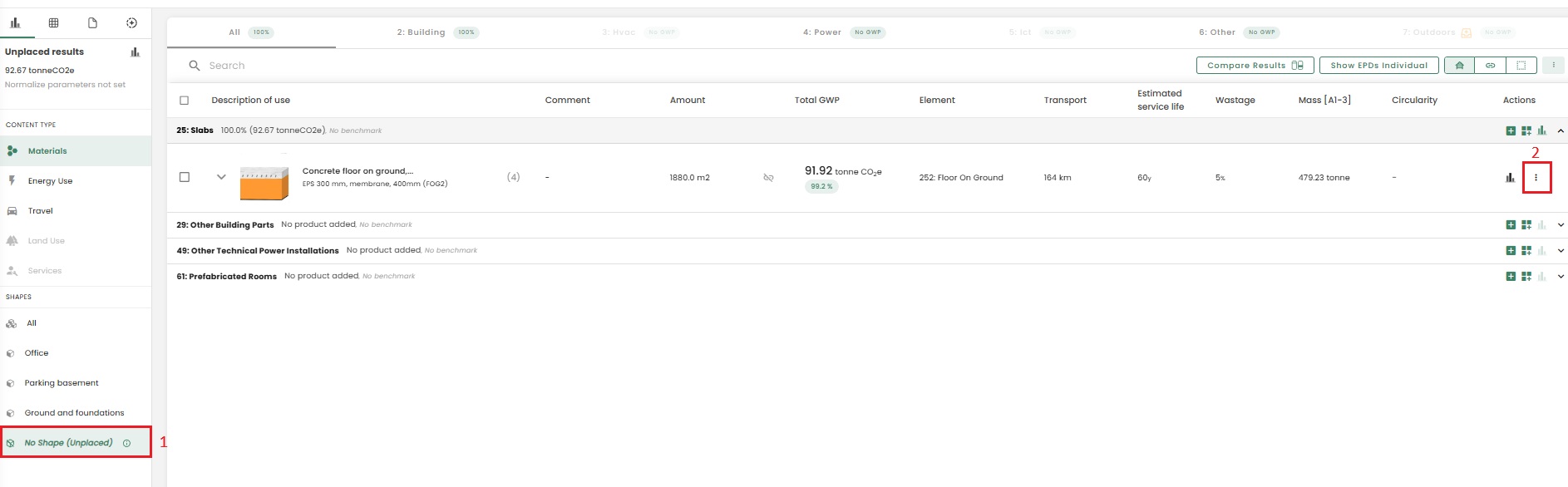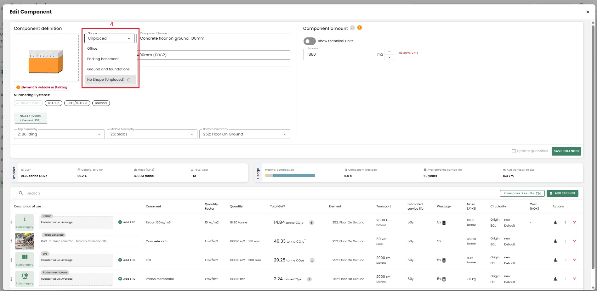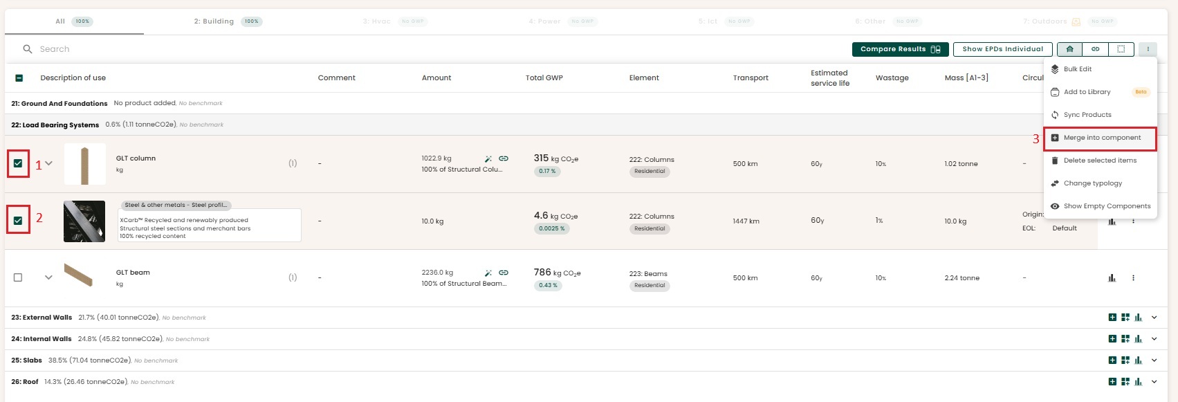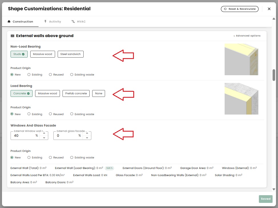 The emissions of reused materials will be reduced by 80% in A1-A3. This is the standard estimate that we have applied for all the schemes, and it is a conservative assumption. You can find the option to change the origin of your product by selecting the "3 dots" that allows you to edit a product.