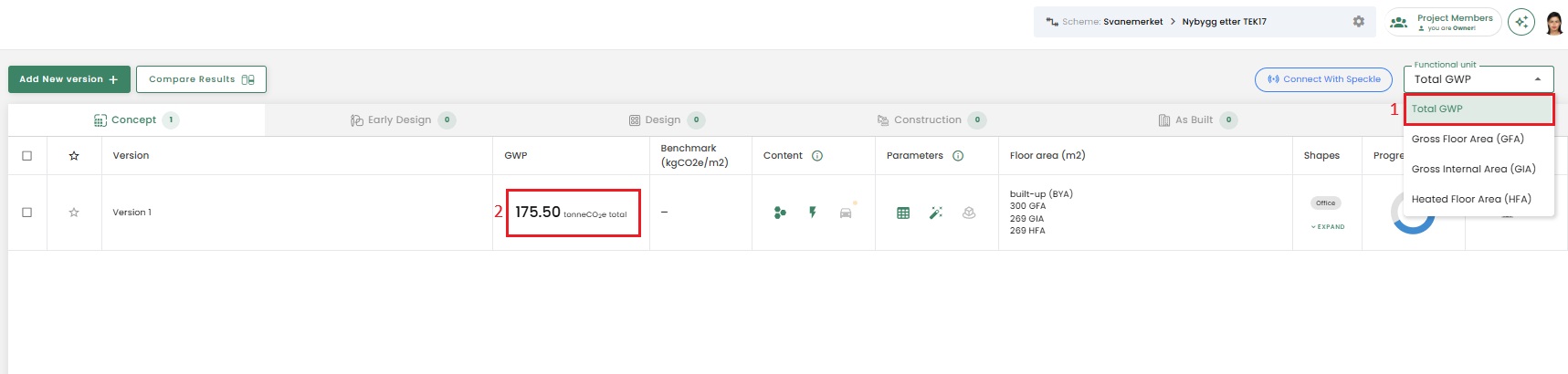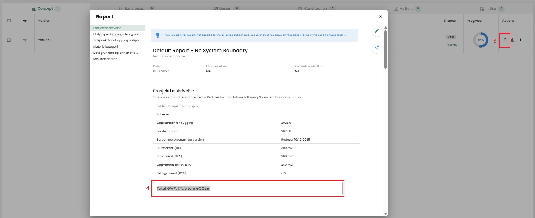 If the total emissions/GWP is not stated in your report, the quickest way to add it manually is to go to your version overview, change the functional unit to "Total GWP", note down the number, select "report" and in the description field in your report add the Total GWP number.