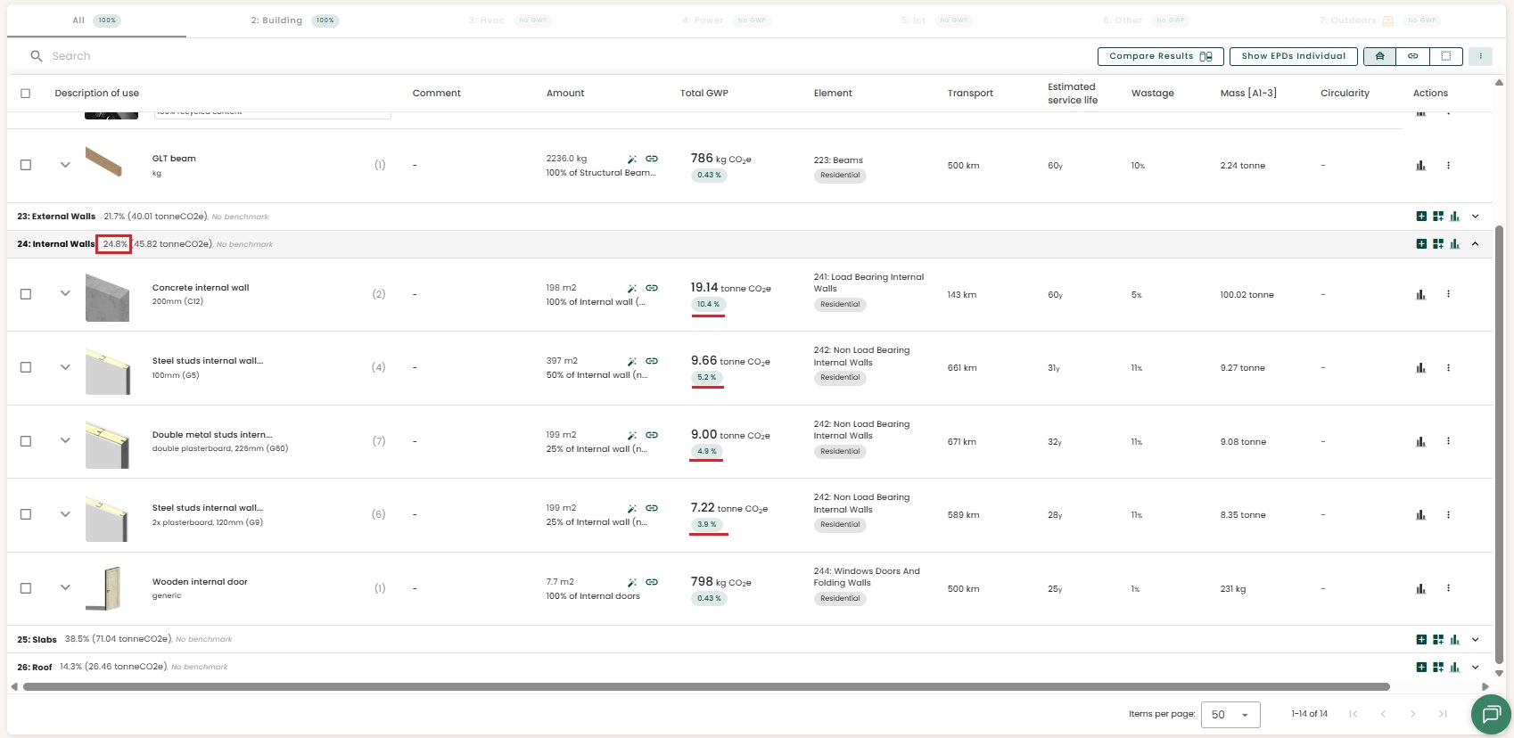 You can understand how the indicative GWP is calculated by selecting on the results button of EPDs. If negative values are registered in phase B for example due to cement's carbonation, the indicative GWP can be lower than the GWP of A1-A3. You can view the exact values of each phase by selecting the "view as table" button on the bottom right corner (see the screenshot below). The same applies to all of the EPDs in the library.